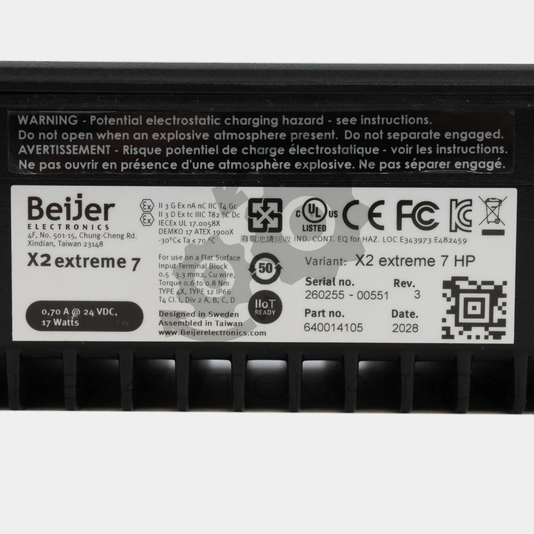 X2 extreme 7 HP; 7-inch rugged HMI with iX runtime; 800 × 480 pixel (16:9) TFT-LCD touch screen; High brightness display; 3.5GB application memory; Ethernet 2x 10/100 Base-T (shielded RJ45); CAN 2x 1 Mbit port; -30°C to +70°C operating temperature; 18-32V DC power