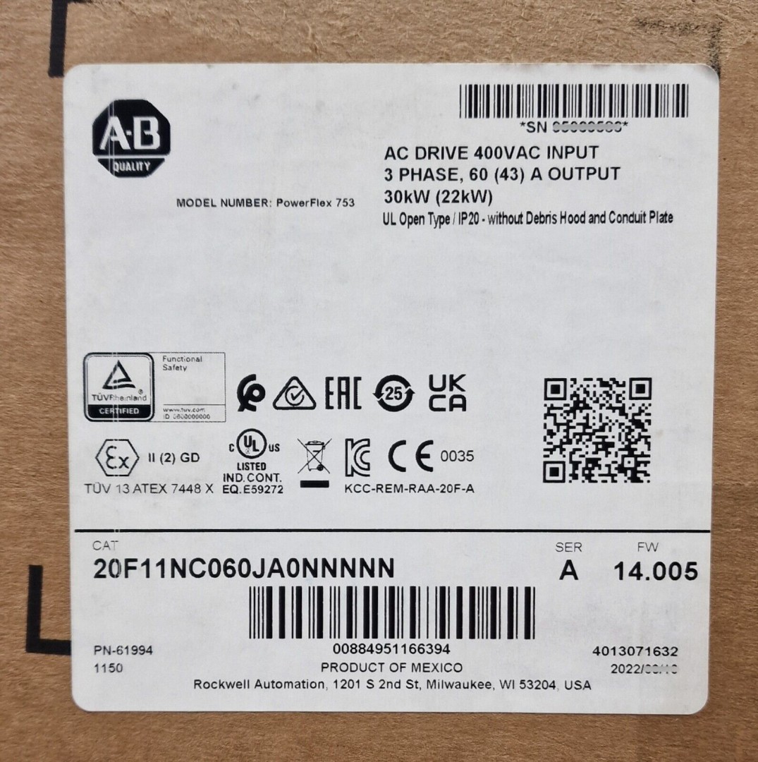 PowerFlex 753 AC Drive, with embedded I/O, Air-cooled, AC input with DC terminals, Open Type, 60 Amps, 30kW (ND), 22kW (HD), 400V Class, 3PH, Frame size: 4, Filtered, CM jumper installed, DB transistor, Blank (no HIM) | FW: 14.005