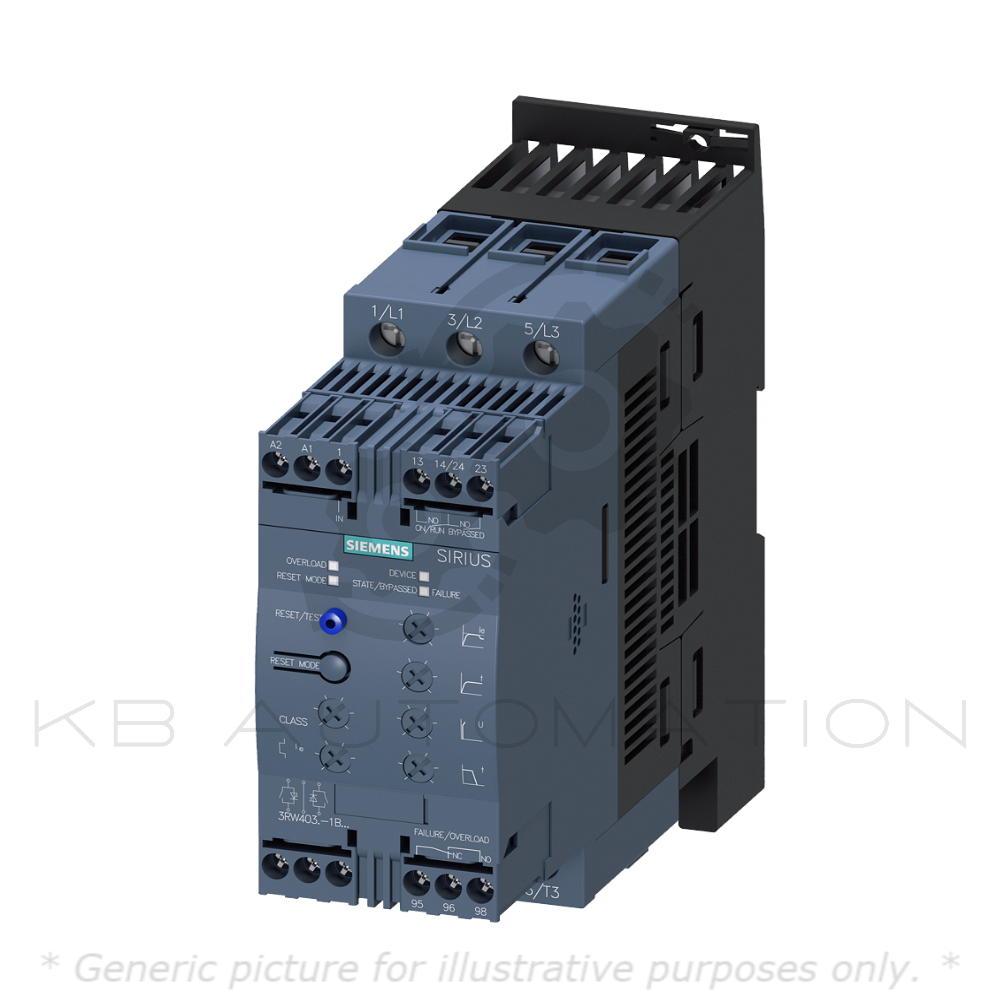 SIRIUS soft starter; Current rating: 45A; Rated power: 22kW (400V); Input line voltage: 200-480V AC, 3-phase, 50-60Hz; Control Voltage: 110-230V AC/DC; Screw terminals