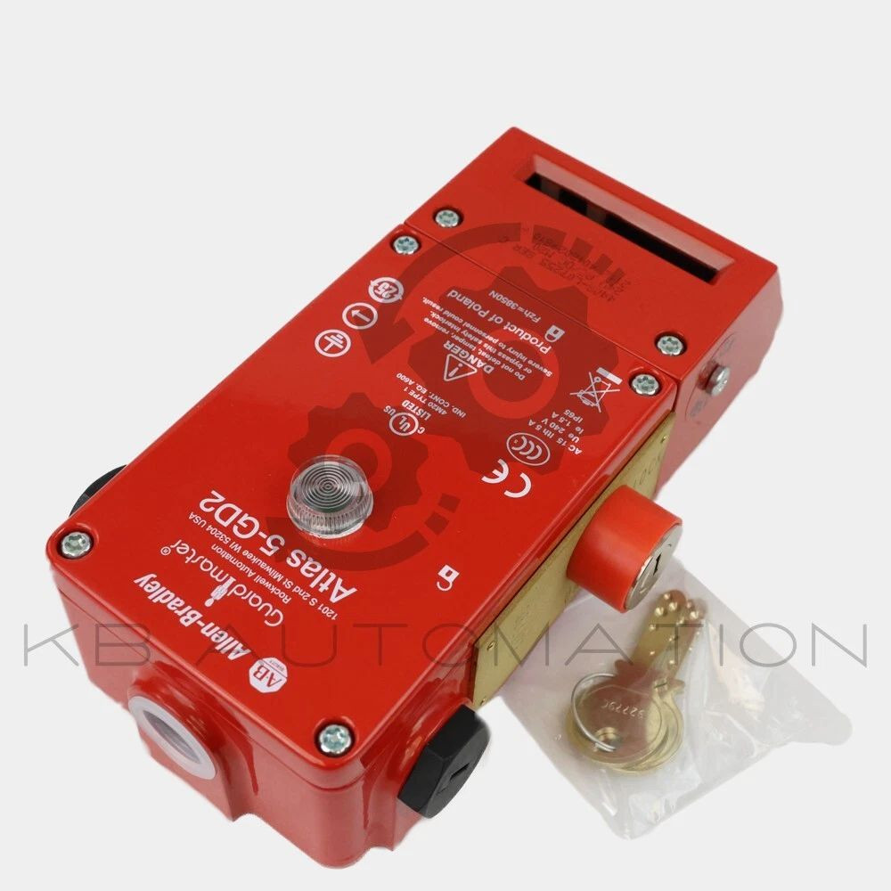 Atlas 5 Guard Locking Switch, LH key lock, solenoid voltage: 24V AC/DC, solenoid contacts: 2 N.C. 1 N.O., contacts (safety and auxiliary): 2 N.C., 1 N.O., actuator: standard, conduit entry: M20