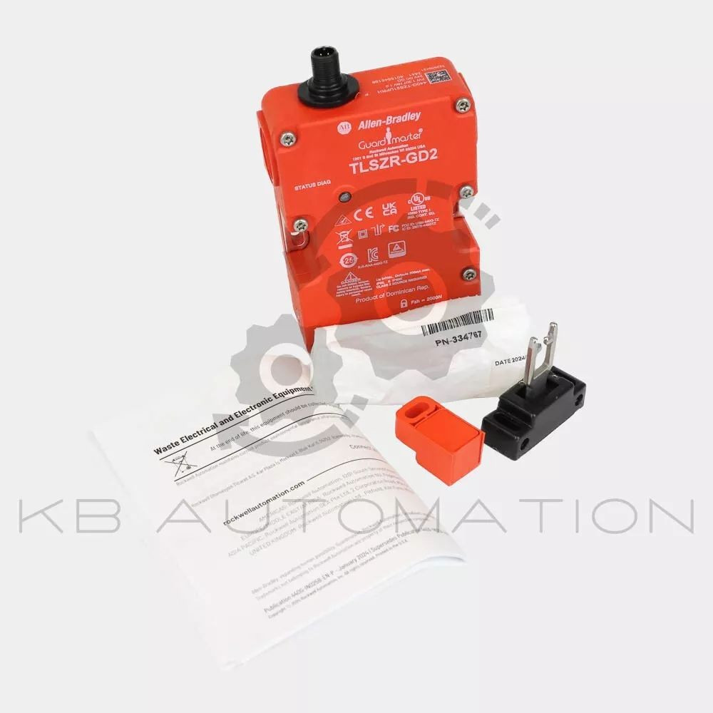 Guardmaster TLSZL-GD2 guard locking switch: power to lock, solenoid voltage: 24V AC/DC, solenoid contacts: none, contacts (safety and aux): 2x PNP (0.2A max.), 1x PNP (0.2A max.) - lock status, actuator: fully-flex, conduit entry: 8-pin micro (M12)
