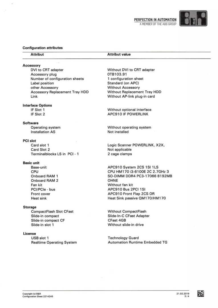 APC910 with 2-slot bus - 2 PCI; CPU board Intel Core i3 6100E - Dual core - HM170 chipset - 2.7 GHz active, 1.9 GHz passive; SO-DIMM DDR4, 8192 MB; CFast 4 GB SLC; POWERLINK (V1/V2) logic scanner module with X2X Link interface; Passive heat sink QM170/HM170