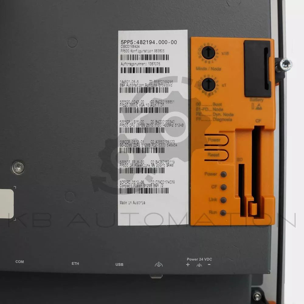 5PP5:482194.000-00 | Power Panel 520 10.4-inch VGA TFT display with touch screen (resistive), connections for 1x RS232, 3x USB 2.0, 1x Ethernet 10/100/1000, can be expanded with an interface board, IP65 protection (front), order 24 VDC connector for power supply separately (screw clamp terminal block: 0TB103.9, cage clamp terminal block: 0TB103.91) | Rev. C0 / D0