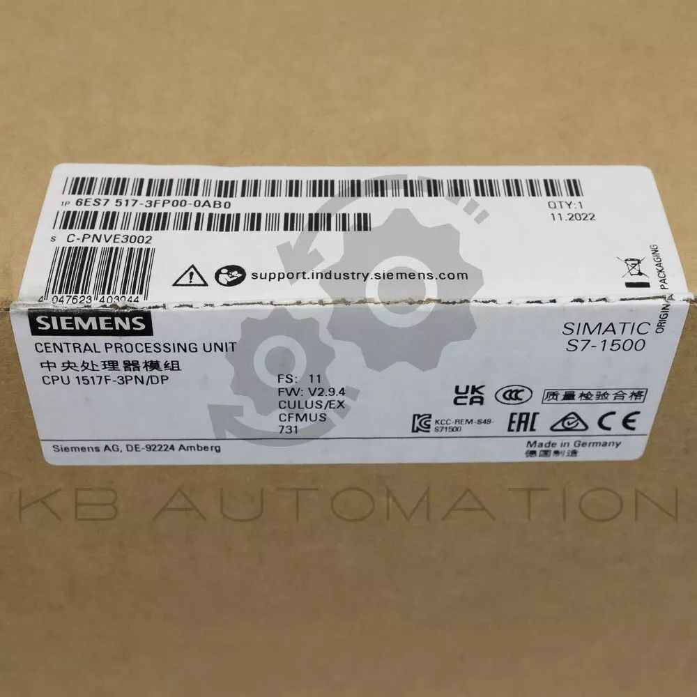 Simatic S7-1500F, CPU 1517F-3 PN/DP, Central processing unit with work memory 3MB for program and 8MB for data, 1st interface: PROFINET IRT with 2-port switch, 2nd interface: PROFINET RT, 3rd interface: PROFIBUS, 2ns bit performance, Simatic Memory Card required