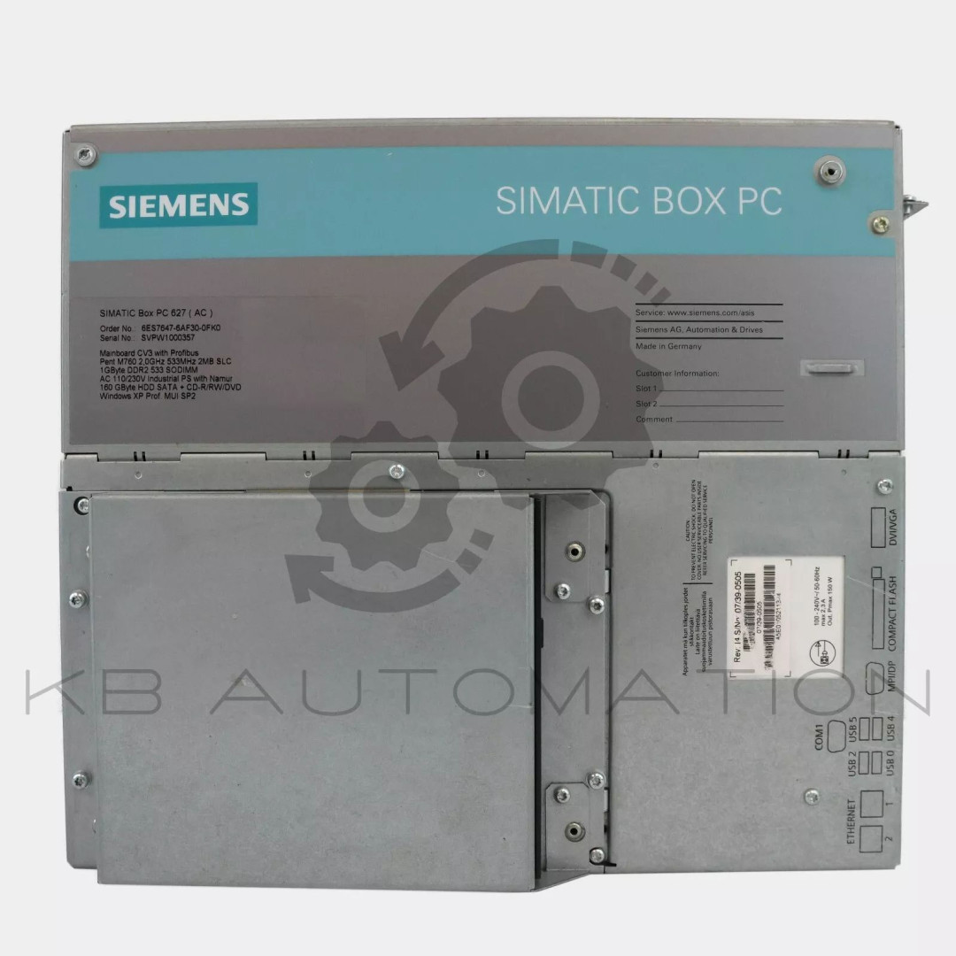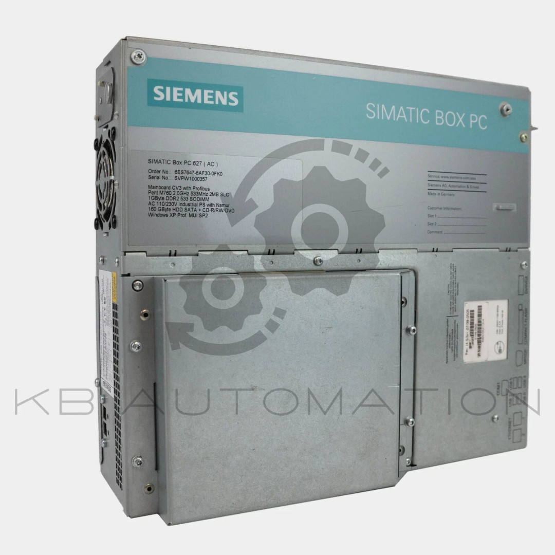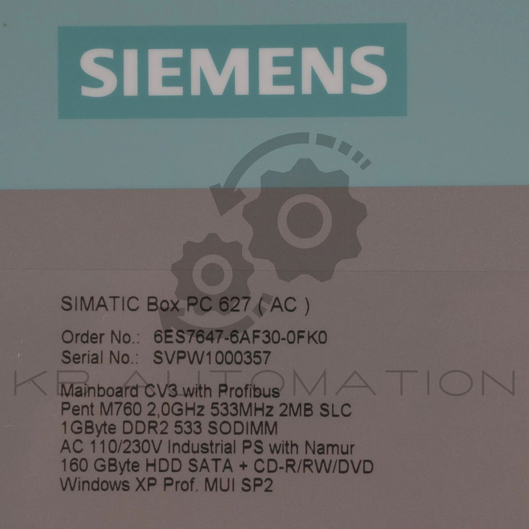 SIMATIC BOX PC 627; AGP GRAPHICS ONBOARD, 8-128 MB SHARED MEMORY; 2X 10/100 MBIT/S ETHERNET RJ45, 4X USB V2.0 (HIGH CURRENT); 1X SERIAL (COM1) RAID-CONTROLLER ON BOARD; 1X SLOT FOR COMPACT FLASH DRIVE, WATCHDOG, TEMP.-/FAN MONITORING; 2 PCI FREE; PENTIUM M 760 2.0 GHZ, 533 MHZ FSB, 2 MB SLC; PROFIBUS/MPI; 1 GBYTE DDR2 533 SODIMM; AC 110/230V INDUSTR. POWER UNIT WITH NAMUR; POWER CABLE EUROPE; WITHOUT EXPANSIONS (HW); 160 GBYTE HDD SATA + DVD+/-RW; WINDOWS XP PROF. MULTI-LANG. SP2 (EN, GE, FR, IT, SP); WITHOUT EXPANSIONS (SW)