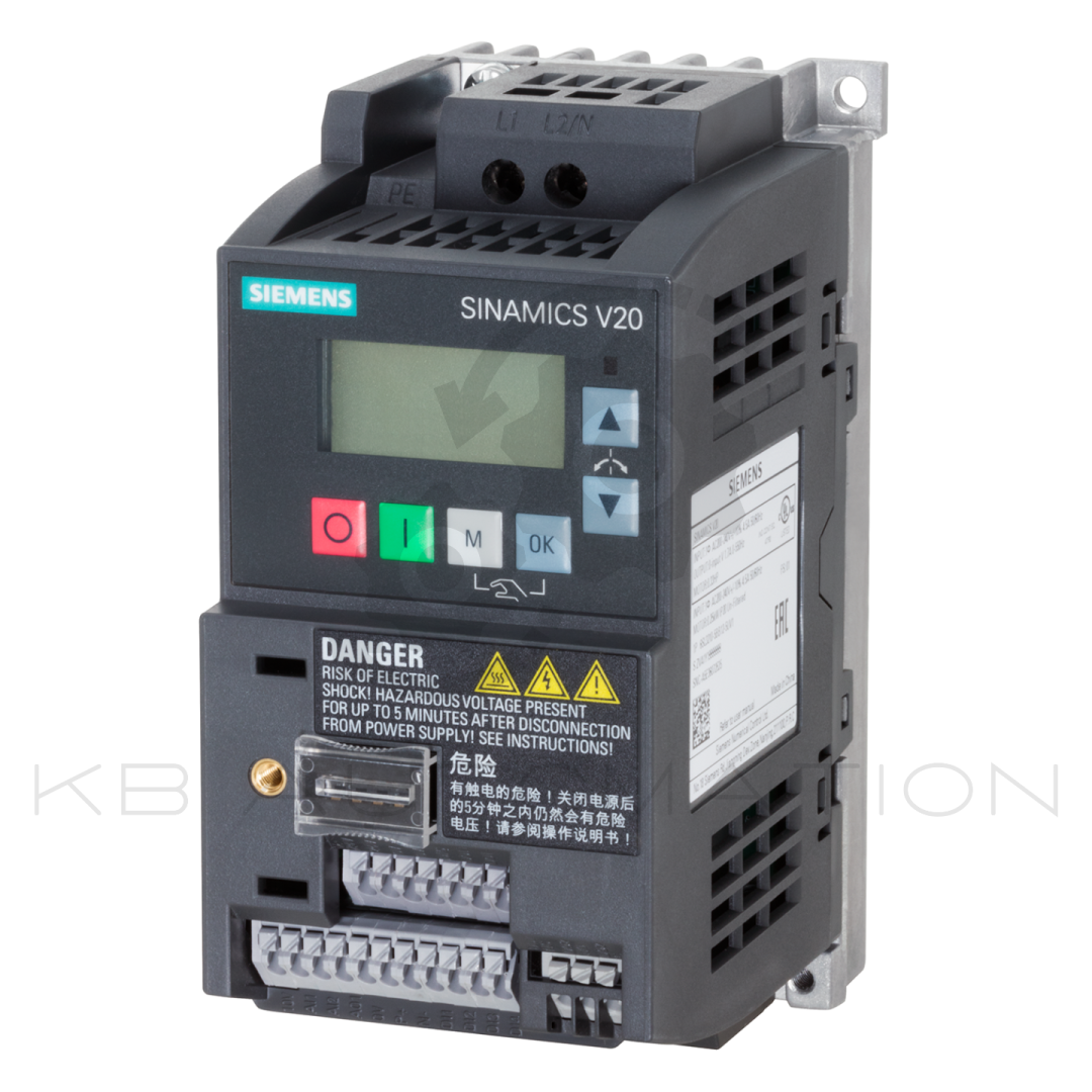 Sinamics V20 Frequency converter; input: 1-phase 200-240V AC ±10% 47-63Hz; output: 0-inputV, motor power 0.37kW; unfiltered, I/O: 4 DI, 2 DO, 2 AI, 1 AQ, fieldbus: USS/MODBUS RTU with built-in BOP