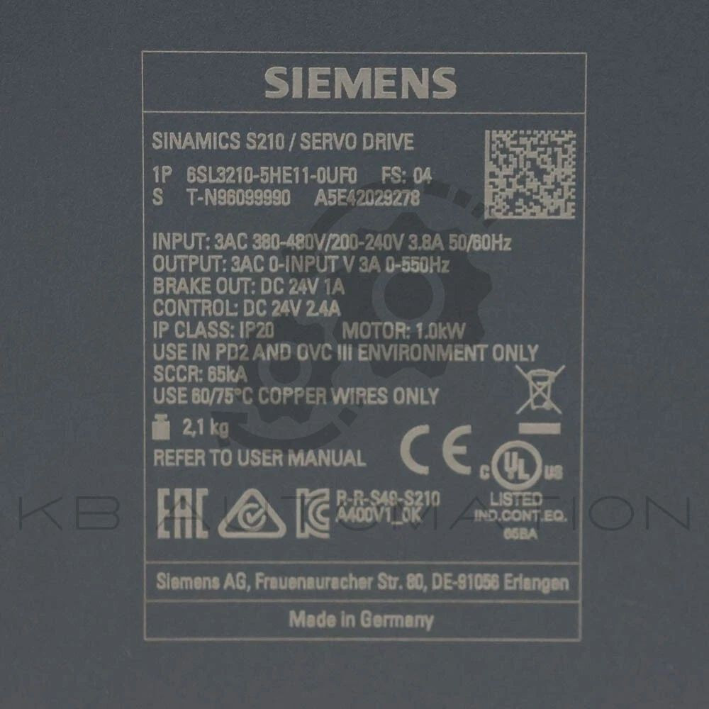 SINAMICS S210 Servo drive; Input voltage: 3-phase 200-480V ±10%, 3.8A, 45-66Hz; Output voltage: 0-inputV, 3.0A, 0-550Hz; Motor: 1.0kW; Degree of protection: IP20; Frame size: A