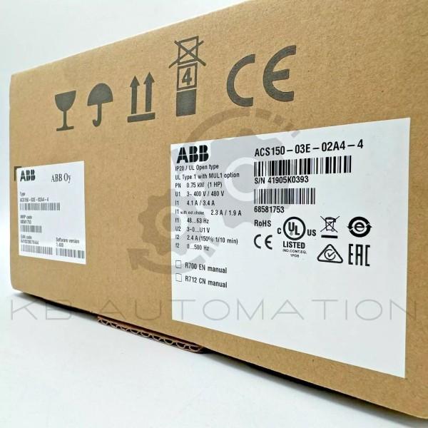 68581753 | ACS150 Series inverter drive; input: 3-phase 380-480V AC 50/60Hz; output: 2.4A, 0.75kW (1.0HP); 1 AI, 5DI; frame size: R1; IP20; includes control unit and PC connection | 3ABD68865832