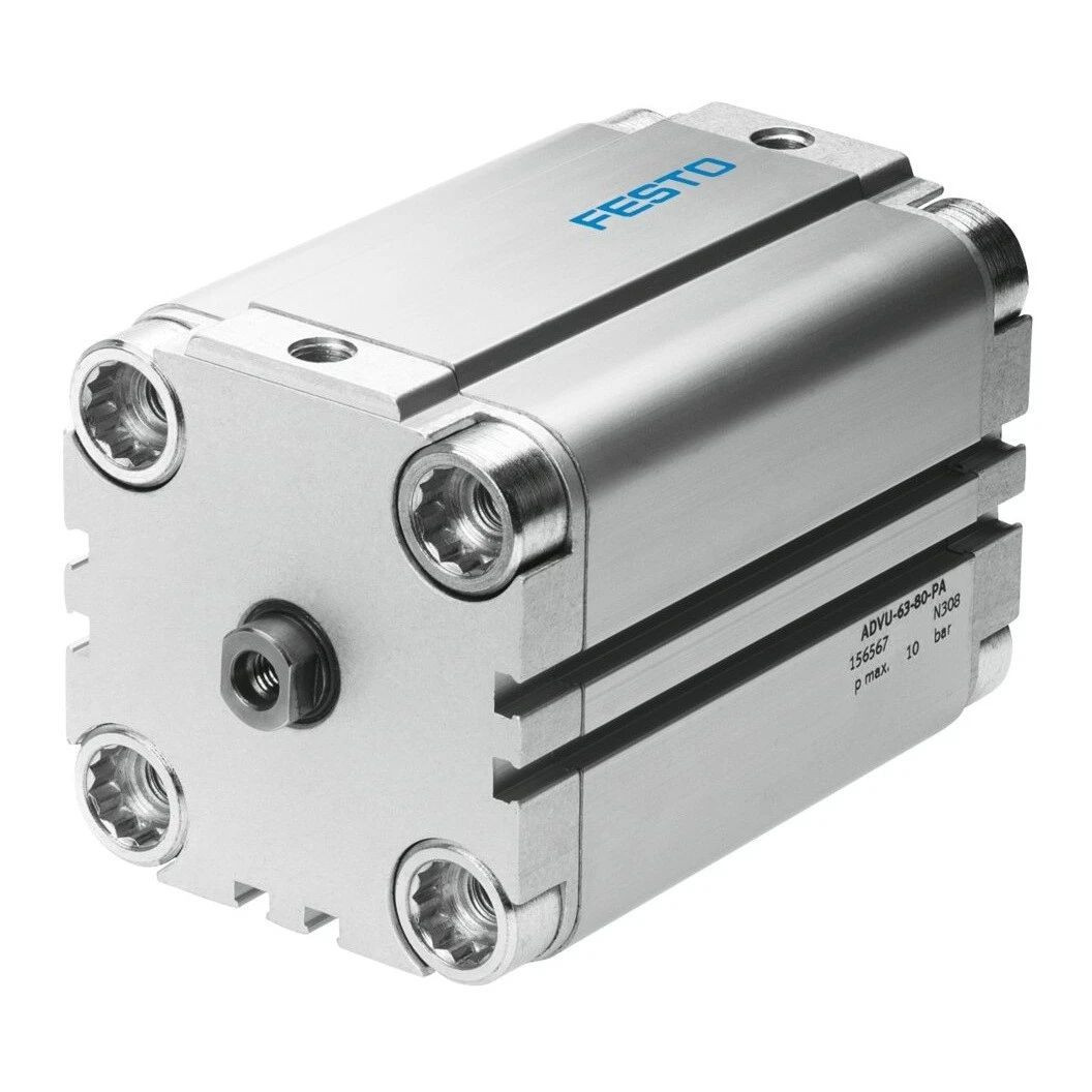 ADVU-80-40-P-A Double-acting compact cylinder; Piston diameter: 80 mm; Stroke: 40 mm; Operating pressure: 0.06 ... 1 MPa (0.6 ... 10 bar); Theoretical force at 0.6 MPa (6 bar, 87 psi), advance stroke: 3016 N; Elastic cushioning rings/plates at both ends
