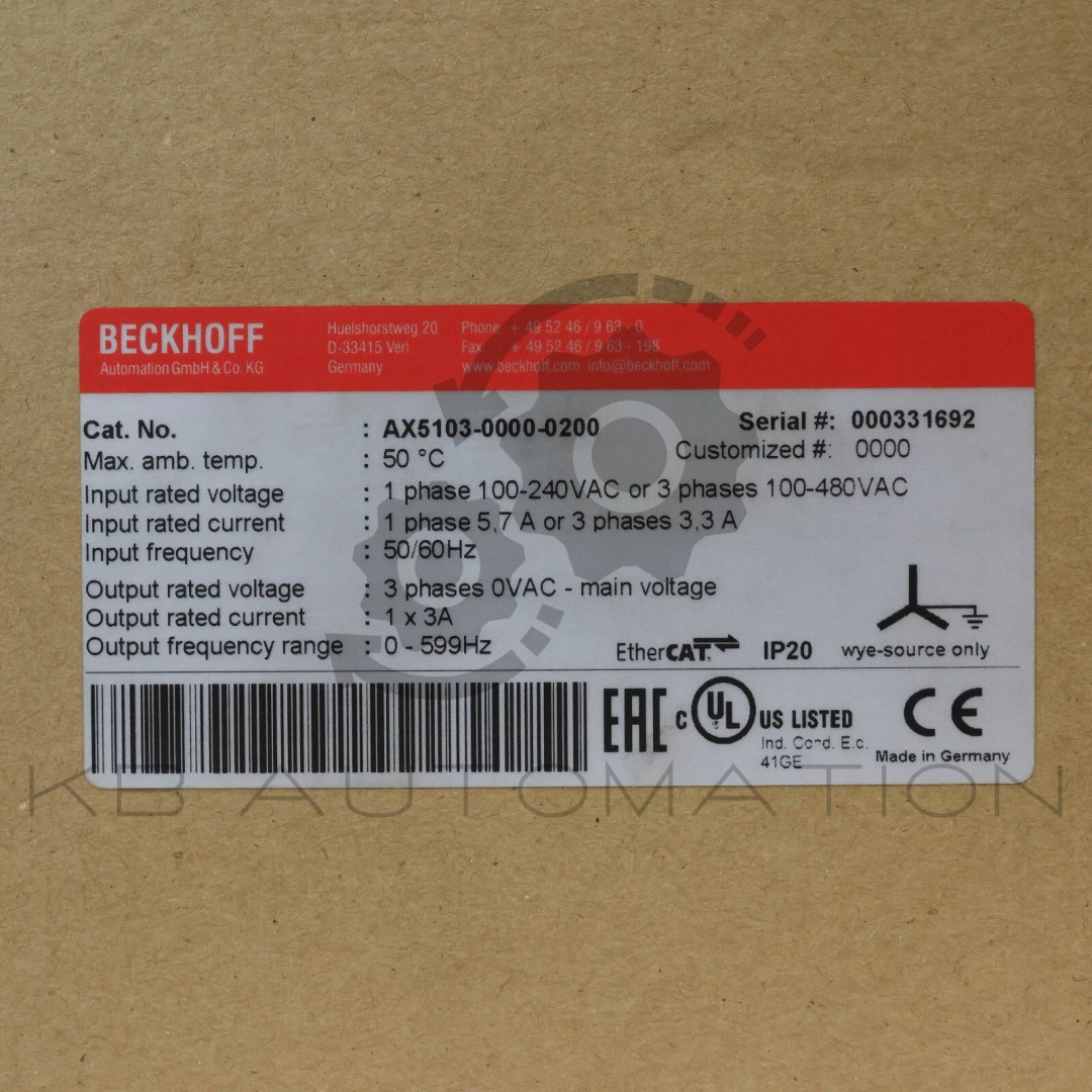 AX5000 Series Digital Compact Servo Drive; 1-axis module; Rated supply voltage: 1x 100-240VAC / 3 x 100-480VAC ±10%; DC link voltage: max. 875 V DC; Rated output current: 3.0 A; Peak output current: 7.5 A; 0-599 Hz rated output frequency; EtherCAT interface; Feedback: SinCos 1 Vpp , resolver , EnDat 2.1 , Hiperface , BiSS B , OCT