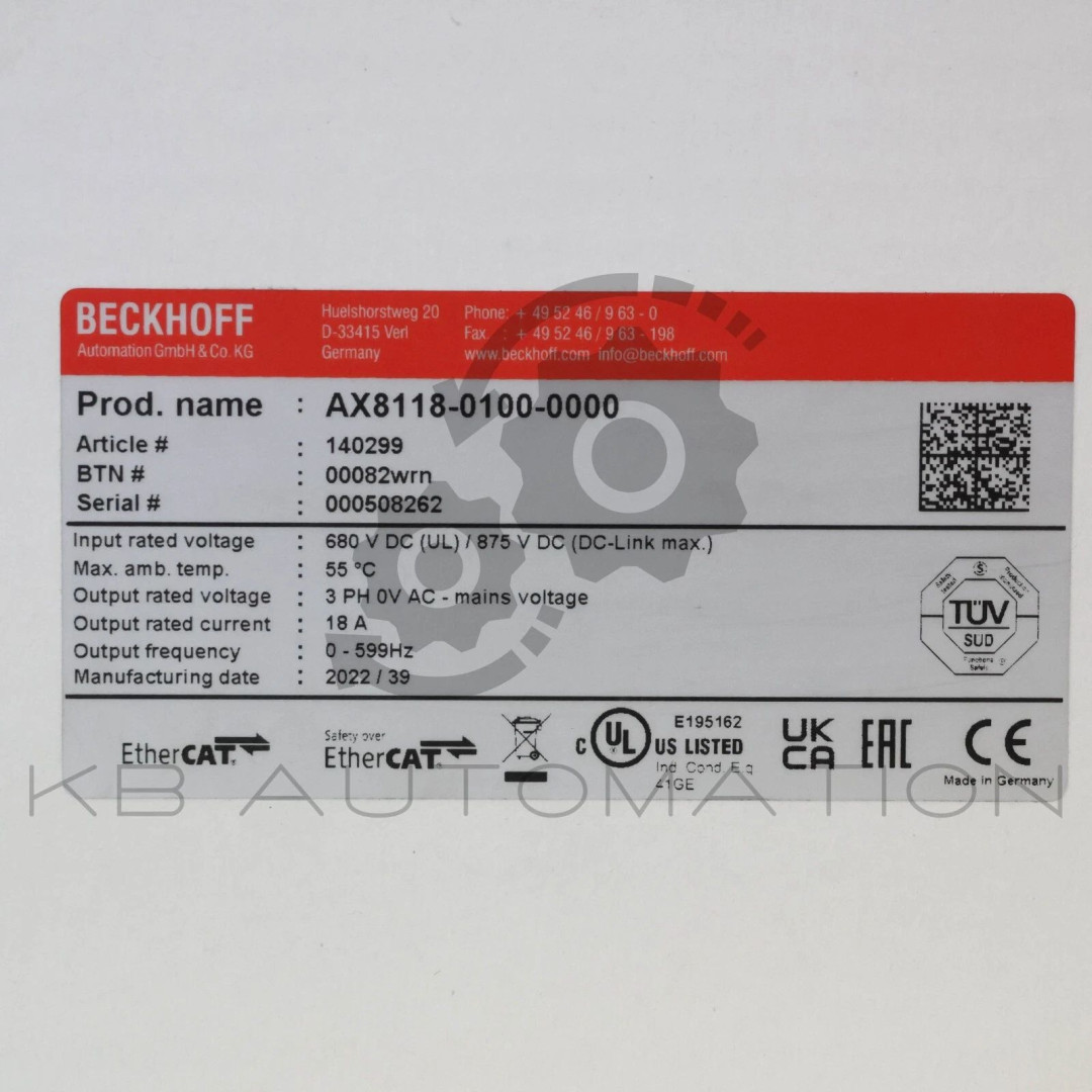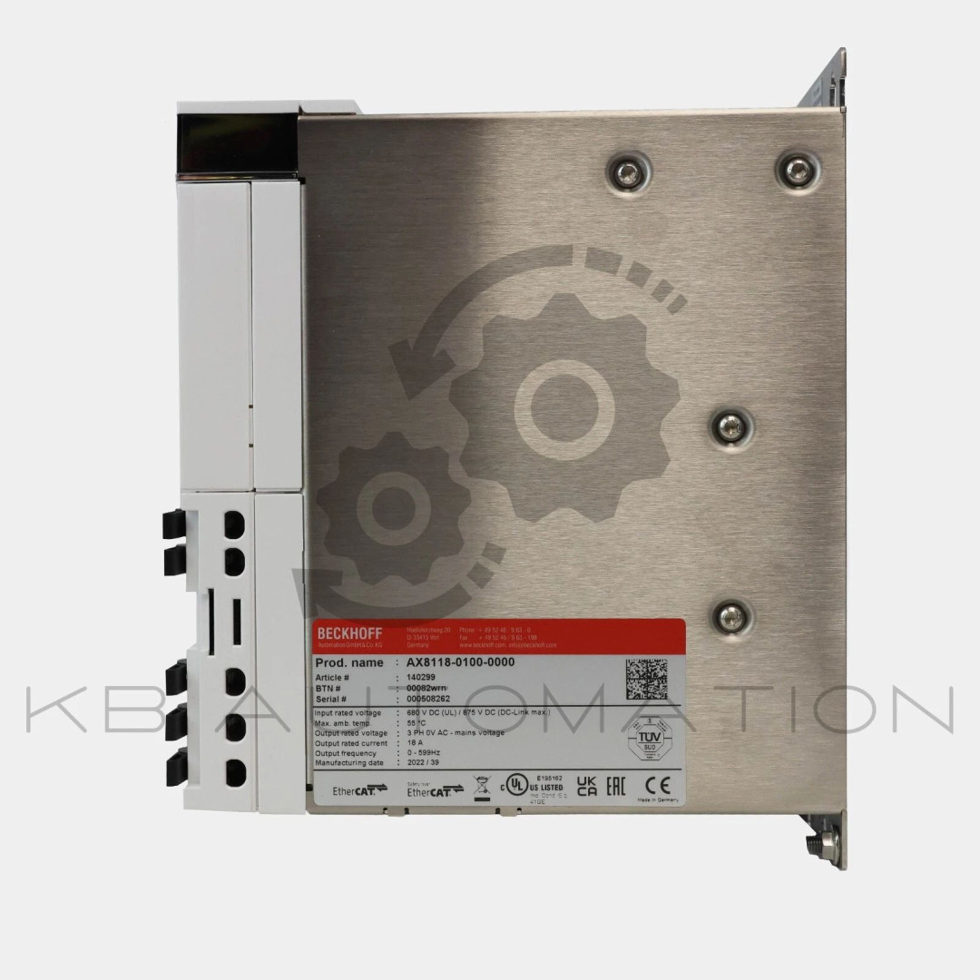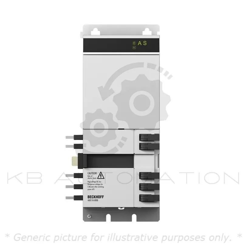 AX8000 Series Single-axis servo drive, axis module with TwinSAFE Logic; input rated voltage: 680 V DC (UL) 875 V DC (DC-Link max.); 18.0 A rated output current (channel); 40.0 A peak output current (channel); OCT, EnDat 3 feedback; Safe Torque Off (STO), Safe Stop 1 (SS1); EtherCAT