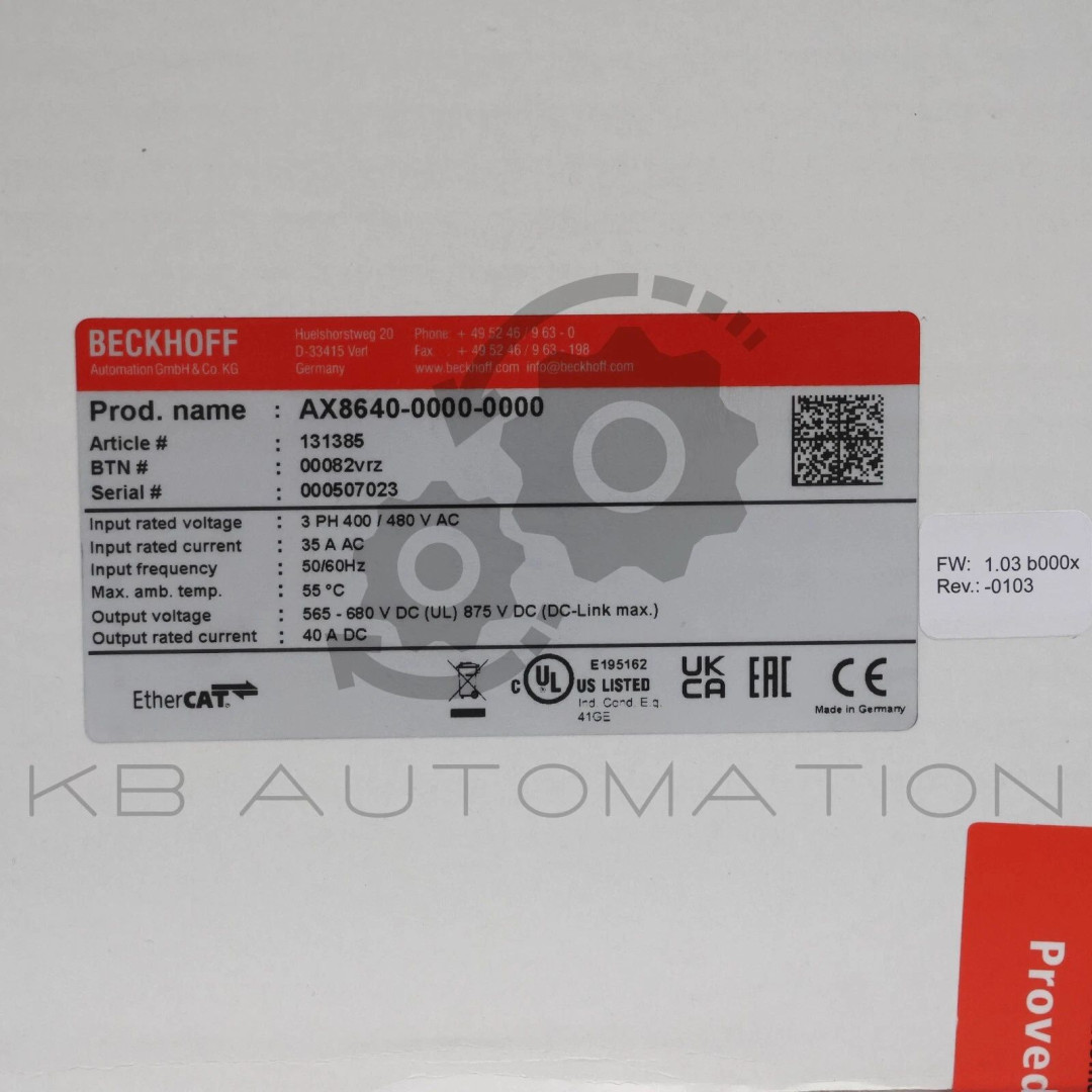 AX8000 Series Power supply module; input rated voltage: 3-phase, 400/480 V AC; output voltage: 565-680 V DC (UL) 875 V DC (DC-Link max.); output rated current: 40 A DC; EtherCAT