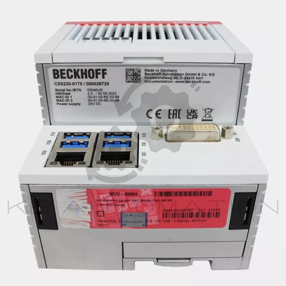 Embedded PC with Intel Atom® x5-E3930, 1.3 GHz, 2 cores; 4 GB DDR3 RAM (not expandable); Interfaces: 2 x RJ45 10/100/1000 Mbit/s, 1 x DVI-D, 4 x USB 3.0, 1 x optional interface; Microsoft Windows 10 IoT Enterprise 2019 LTSC, 64-bit, TwinCAT 3 runtime (XAR), no licenses included