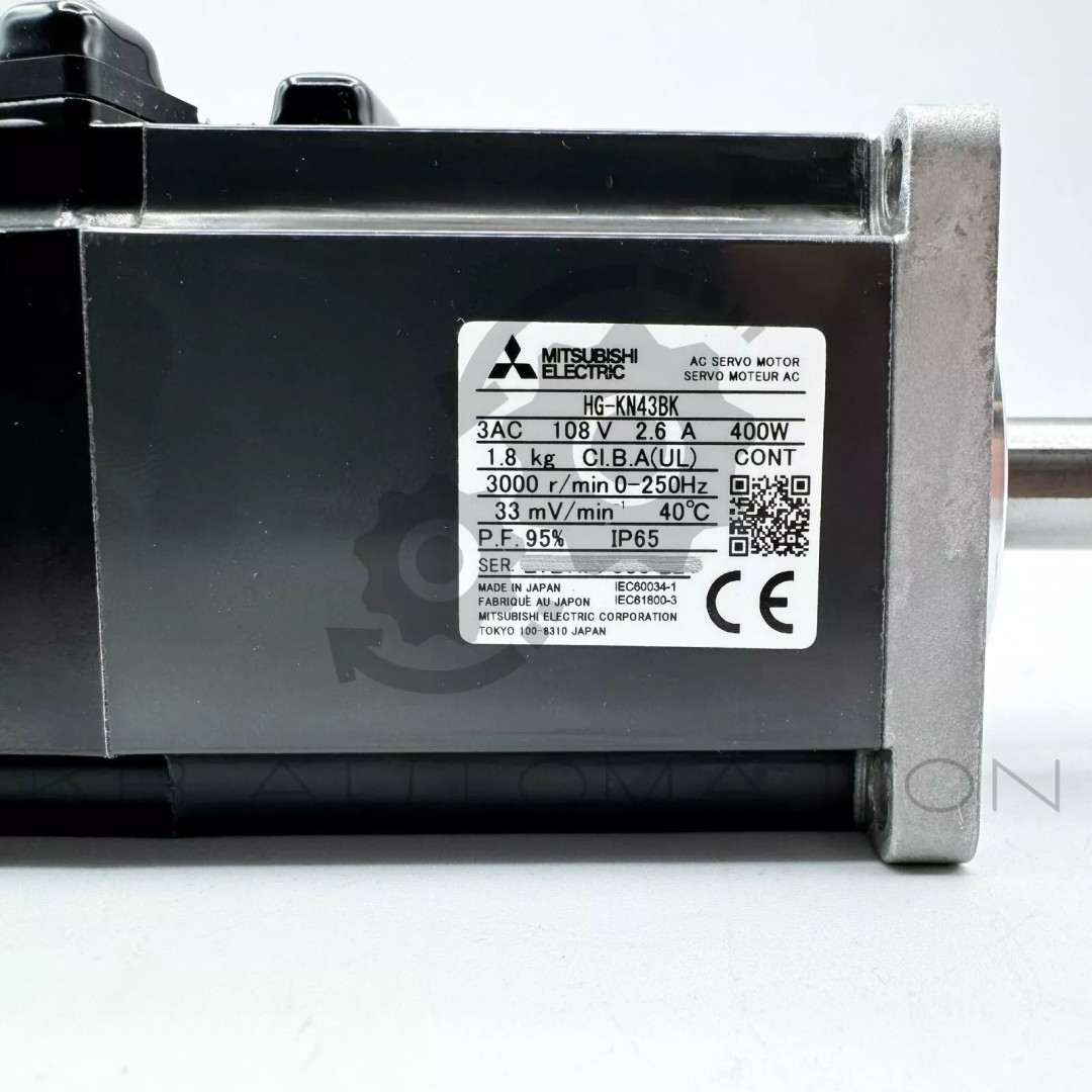 MELSERVO-JE Servo motor type: HG-KN, rated power: 400 W; power supply: 200 VAC; torque 1.3 Nm, max. torque 3.8 Nm; rated speed: 3000 rpm; max. speed: 5000 rpm; with holding brake; keyed shaft; encoder type: 17-bit