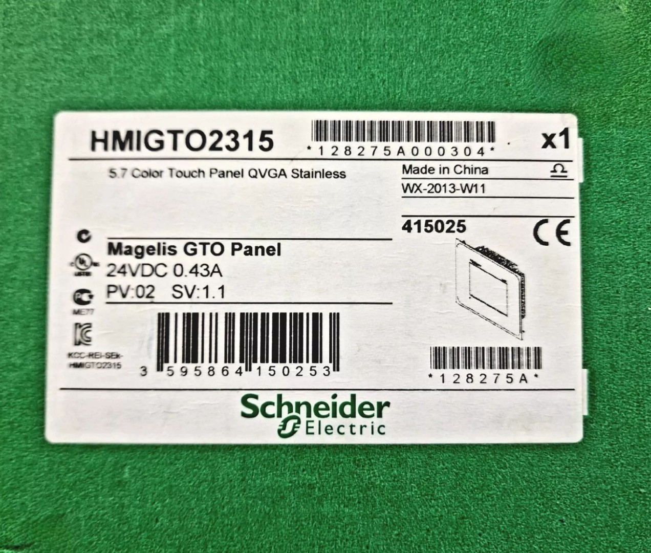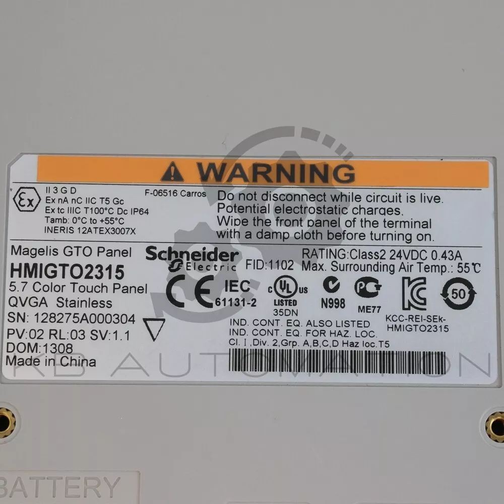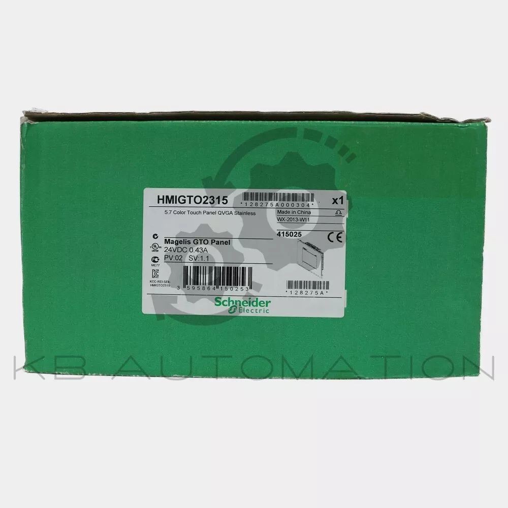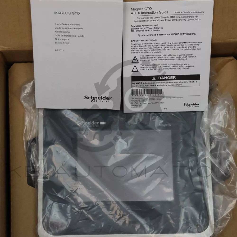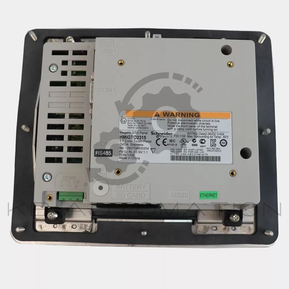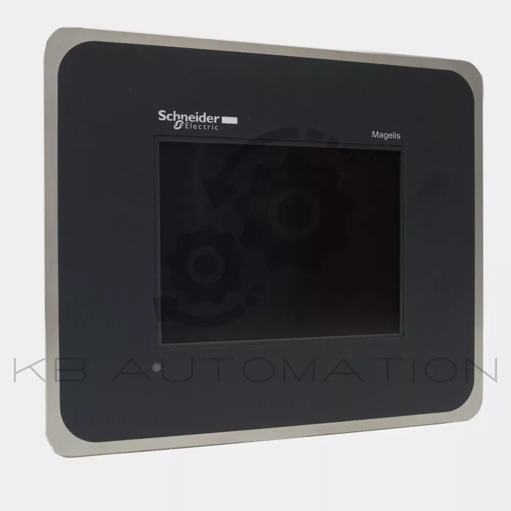 Magelis GTO IP66K touchscreen operator interface (HMI), 5.7-inch color TFT LCD display with a stainless steel frame, 320 x 240 pixels (QVGA), 96MB EPROM, 1 SD card slot, 1 host + 1 mini-B USB ports, 1 RS232C port and 1 Ethernet TCP/IP port, 24V DC supply