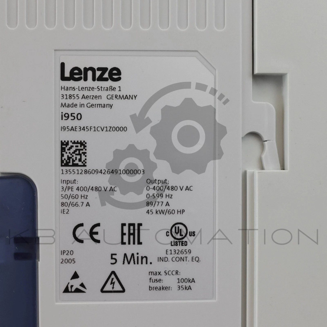 i950-C45/400-3 Control cabinet servo inverter; Rated power: 45 kW/60 HP; Rated mains voltage: 3/PE 400/480 V AC; Integrated RFI filter; Output current: 89/77 A; Extended Safety; System bus network: EtherCAT; Output frequency: 0-599Hz | Material number: 16205533