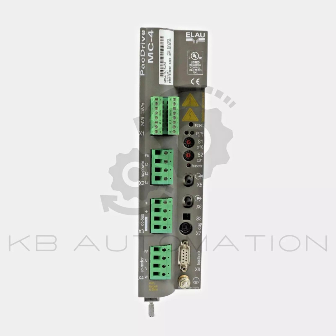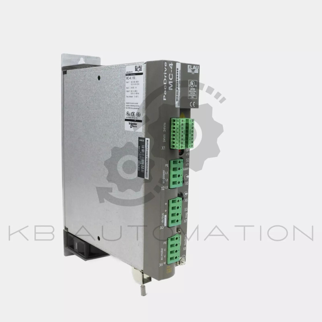 Elau by Schneider Electric PacDrive MC-4 / 10 A Servo drive; Rated supply voltage: 3AC 380-480 V (±10%) 48-62 Hz, 10.2 A; DC-circuit voltage: 530-680 V DC; Rated current 8 kHz (INC): 10.0 Aeff, Peak current 1 s (ISC): 25.0 Aeff; Rated output: 6.9 kVA; Control voltage: 24 V DC | SW: 00.22.xx | Material number: 13130247