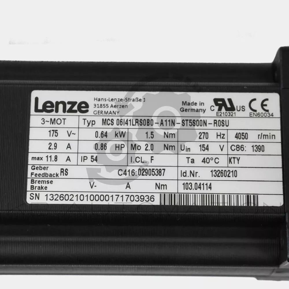 Type MCS06I41LRS0B0 Compact servo motor; Rated power: 0.64 kW; Rated torque: 1.5 Nm; Rated speed: 4050 rpm; Rated voltage: 175 V; Rated frequency: 270 Hz; Rated current: 2.9 A; Motor shaft: 11x23 without feather key; IP54; Feedback: resolver RS0; Without holding brake; Motor protection: KTY | Material number: 13260210 | Motor option: Mt.Nr. 103.04114