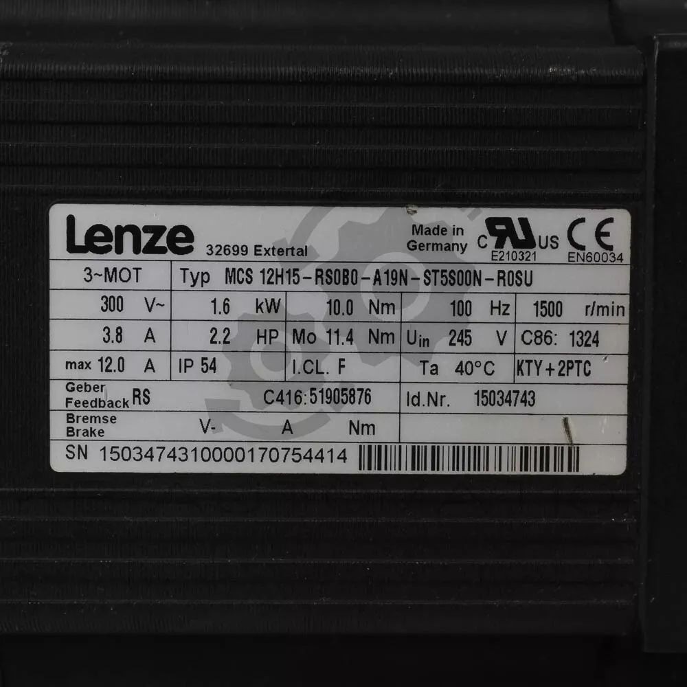 Type: MCS12H15-RS0B0 Compact servo motor; Rated power: 1.6 kW; Rated torque: 10.0 Nm; Rated speed: 1500 rpm; Rated voltage: 400 V; Rated frequency: 100 Hz; Rated current: 3.8 A; Motor shaft: 19x40; IP54; Feedback: resolver RS0; Without holding brake; Motor protection: KTY83 + PTC | Material number: 15034743