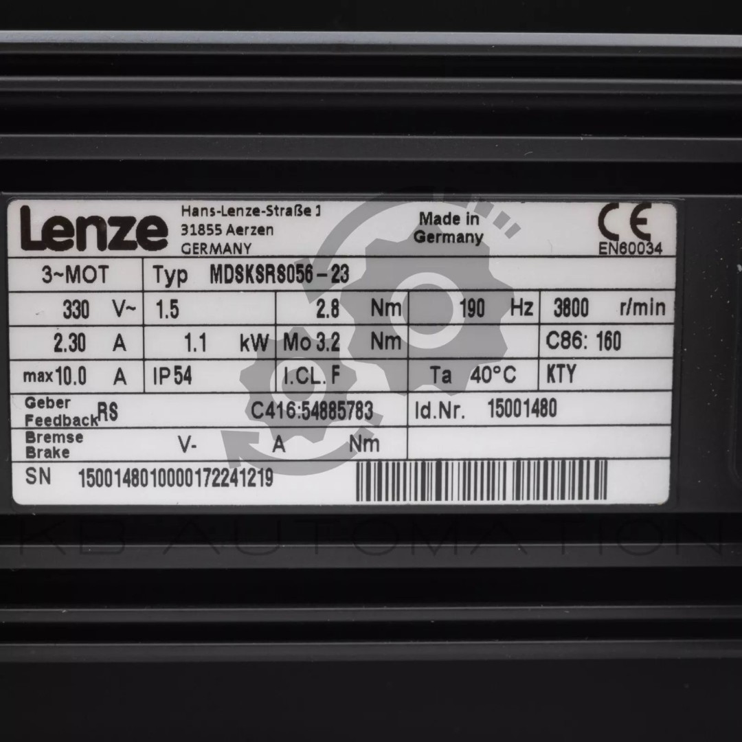 MD Series Synchronous servo motor without holding brake; Rated power: 1.1 kW; Rated torque: 2.8 Nm; Rated speed: 3,800 rpm; Rated voltage: 330 V; Rated frequency: 190 Hz; Rated current: 2.3 A; IP54; Feedback: resolver RS0; Motor protection: KTY | Material number: 15001018
