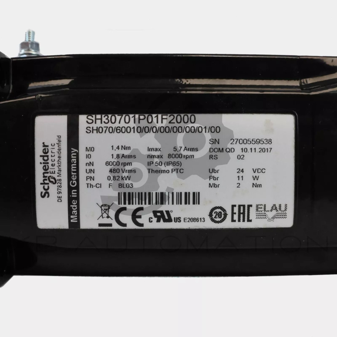 SH070/60010/0/0/00/00/00/01/00 PacDrive 3 Servo motor with holding brake (3.0 Nm); Motor flange size: 70 mm; Pn: 0.82 kW; Umax: 480 Vrms; I0: 1.8 Arms; Imax: 5.7 Arms; nN: 6000 rpm; nmax: 8000 rpm; M0: 1.4 Nm; Thermo: PTC | SH30701P01F2000