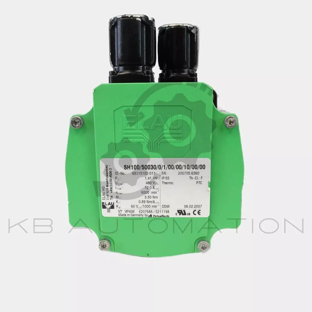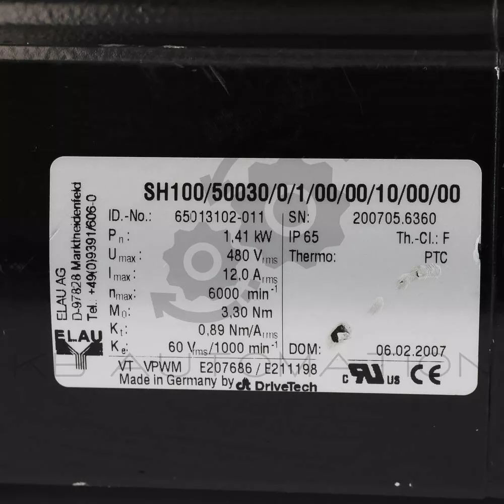 Elau AG SH100/50030/0/1/00/00/10/00/00 PacDrive 3 Servo motor, without holding brake; Motor flange size: 100 mm; Pn: 1.41 kW; Umax: 480 Vrms; Imax: 12.0 Arms; nmax: 6000 rpm; M0: 3.30 Nm; Thermo: PTC; IP65 | ID-No 65013102-011 | SH31001P11A2100