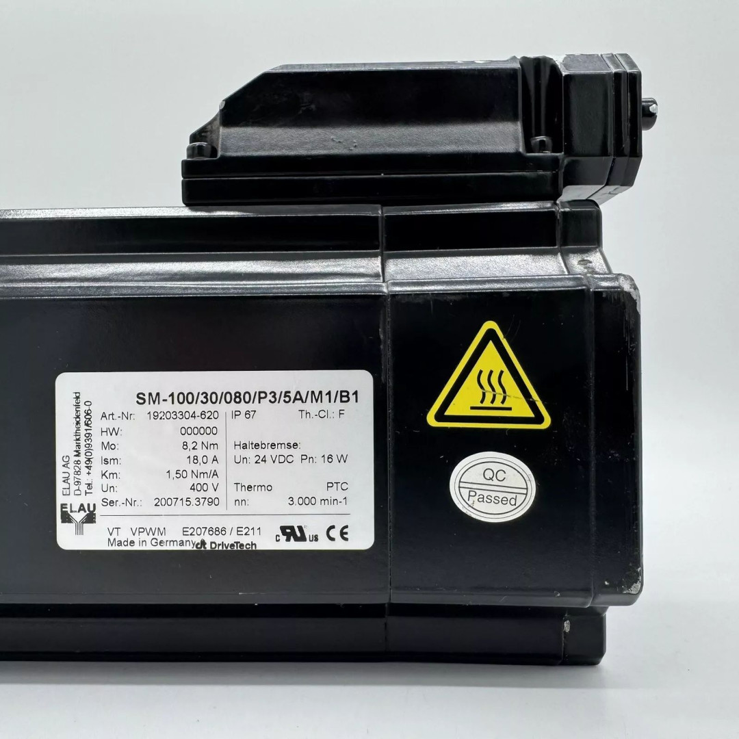 Elau SM-100/30/080/P3/5A/M1/B1 PacDrive SM Series Servo motor, with holding brake (Un: 24 VDC, Pn: 16 W); Flange size: 100 mm; Speed: 3000 rpm; Torque: 8.2 Nm; Stainless steel shaft without feather groove (smooth shaft); Encoder: SinCos multi-turn; IP67 (with option barrier pressure system); Thermo: PTC | ID-No 19203304-620