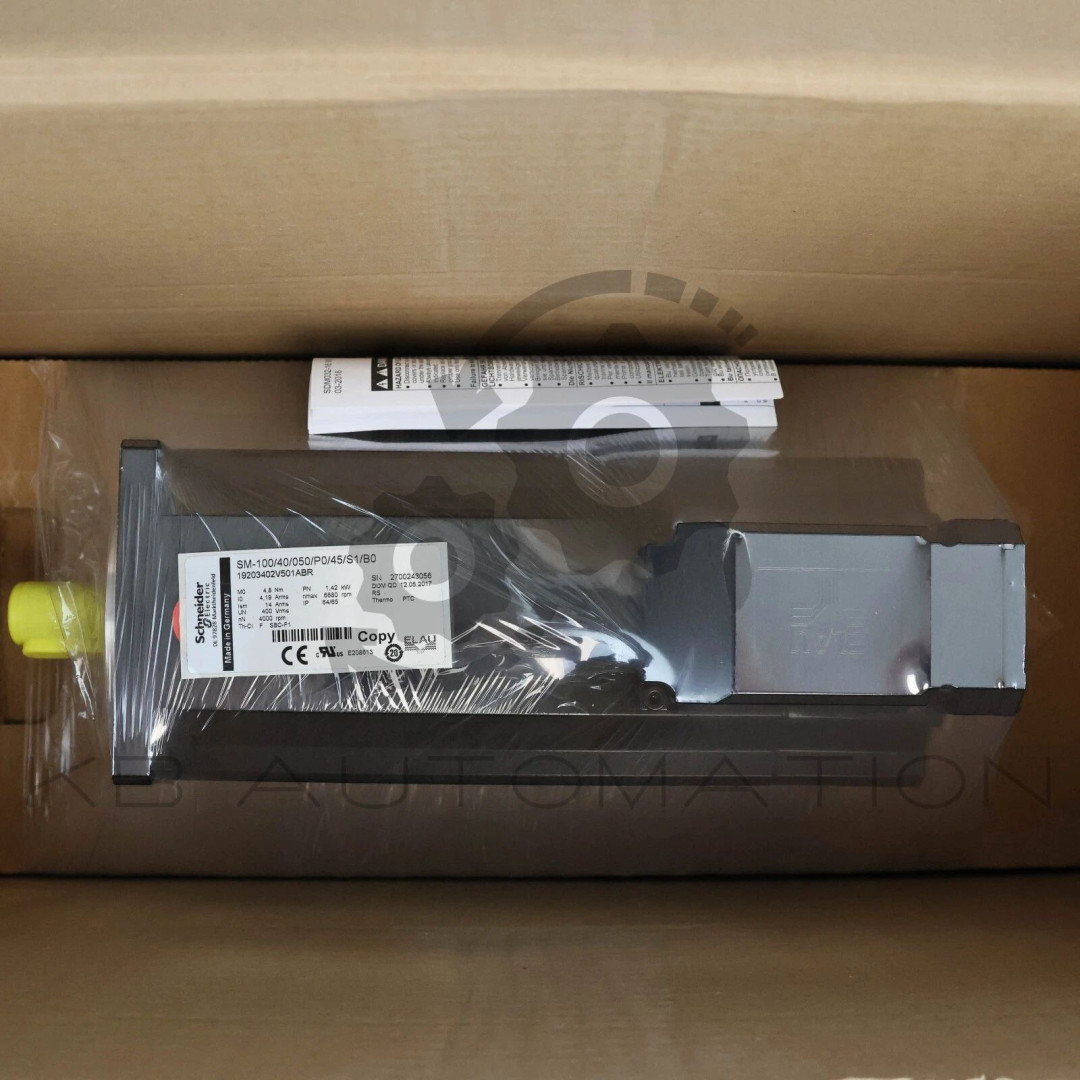 Elau by Schneider Electric SM-100/40/050/P0/45/S1/B0 PacDrive SM Series servo motor without holding brake; Frame size=100 mm, Un=400 V, M0=4.8 Nm, I0=4.19 Arms, Ism=14.0 Arms, PN=1.42 kW, nN=4000 rpm; Thermo: PTC; Single-turn encoder; IP65 | Art-Nr. 19203402V501ABR